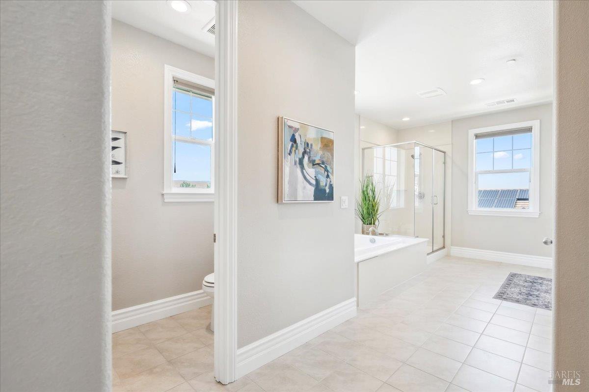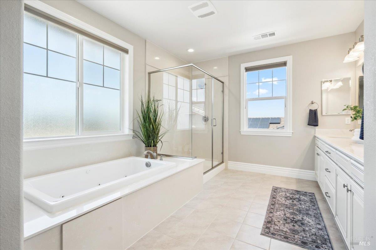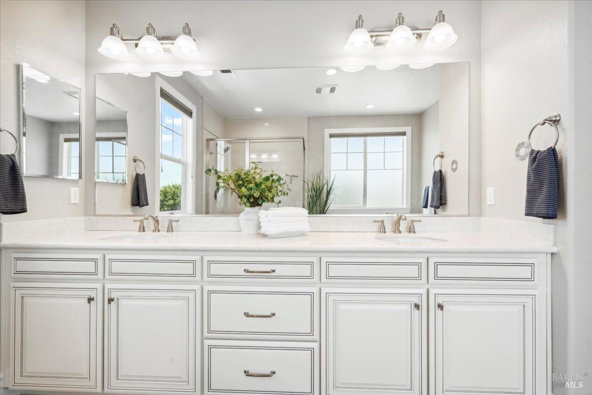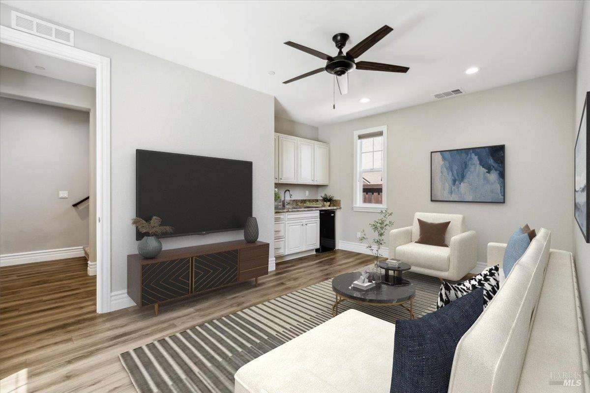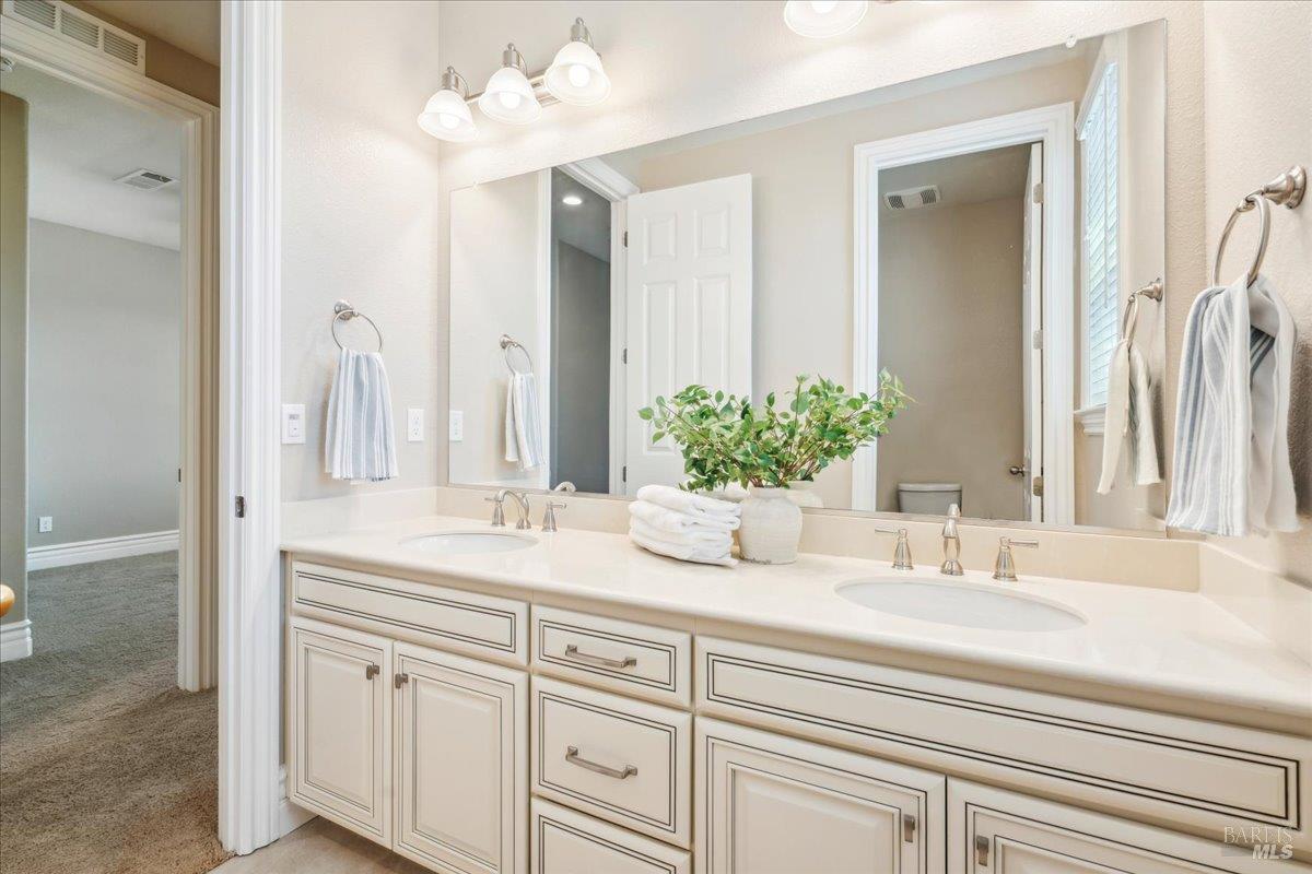 Discover refined living in this stunning six bedroom, four and one-half bath home in Vacaville's desirable Vanden Estates, within the sought-after Travis School District. Just about 5 years old and better than new, it offers premium upgrades and thoughtful design throughout. Two downstairs suites-one a attached ADU private unit with a kitchenette, living room, bedroom, and bathroom. The other a spacious and comfortable guest ensuite. The open-concept great room features a fireplace and center-opening glass doors to a covered patio with its own fireplace and built-in outdoor BBQ.